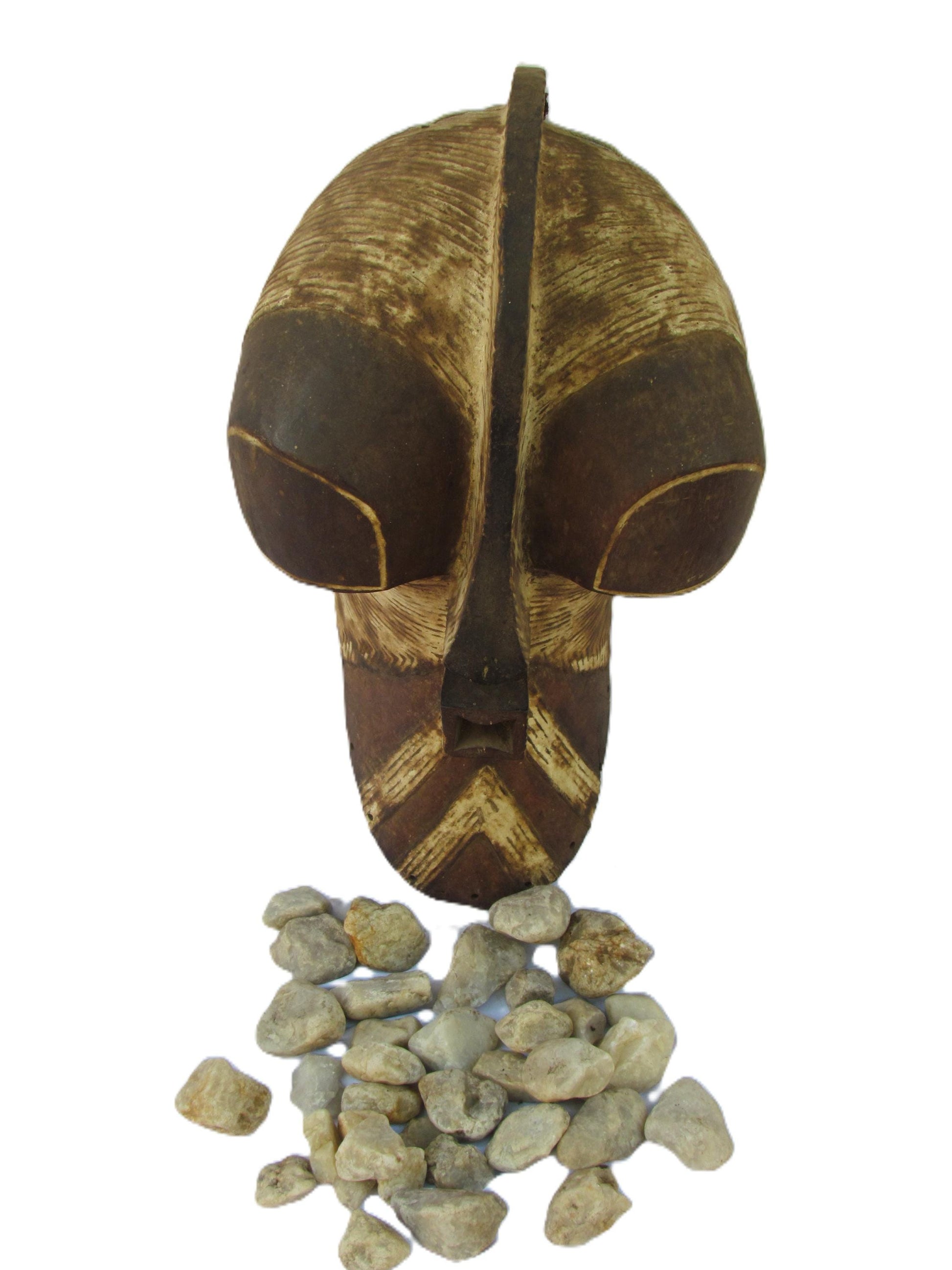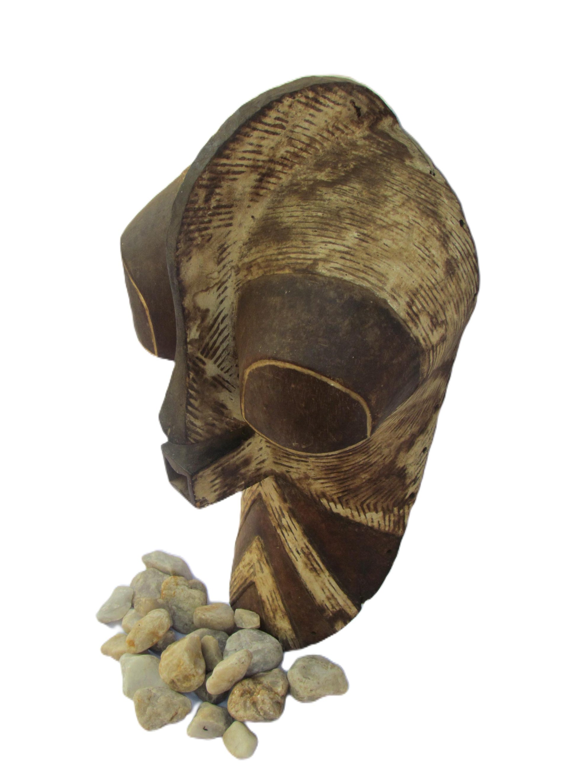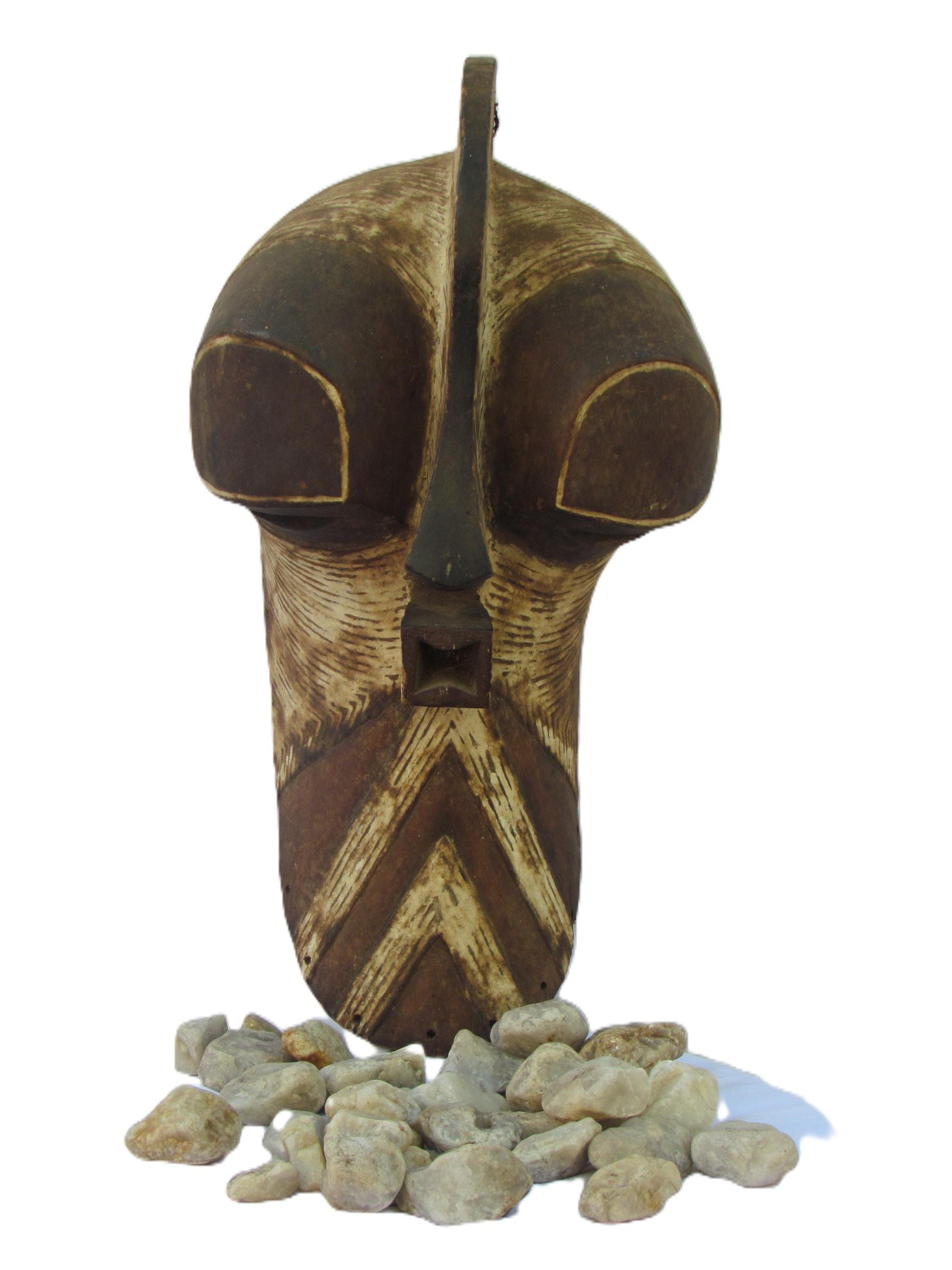 Esta gran máscara tribal Kifwebe es una pieza ceremonial artesanal del pueblo Songye de la República Democrática del Congo. Tradicionalmente utilizada en danzas rituales, presenta audaces tallas lineales, una boca cuadrada prominente y una nariz alargada, todo ello tallado en una sola pieza de madera. La superficie estriada simboliza poder, misterio y presencia ancestral. Una impactante pieza de arte mural que fusiona la historia cultural con una audaz estética tribal, perfecta para coleccionistas o como elemento decorativo.