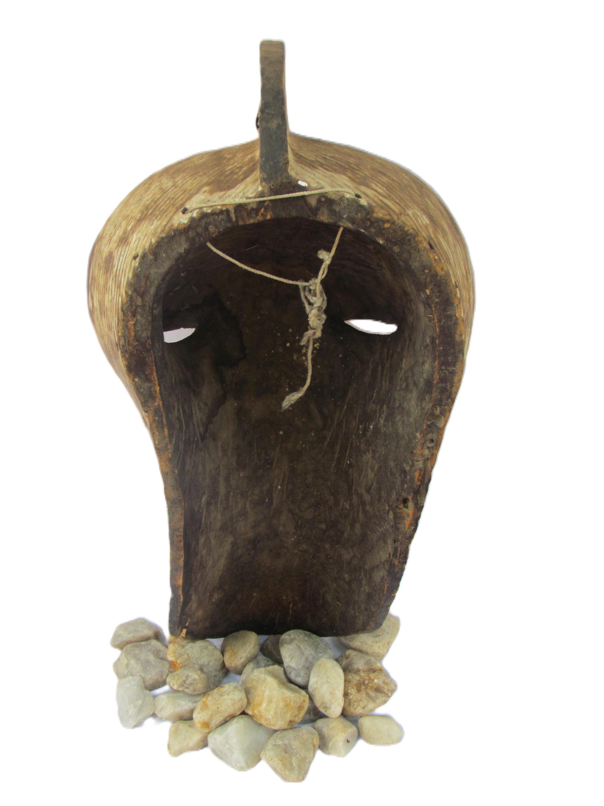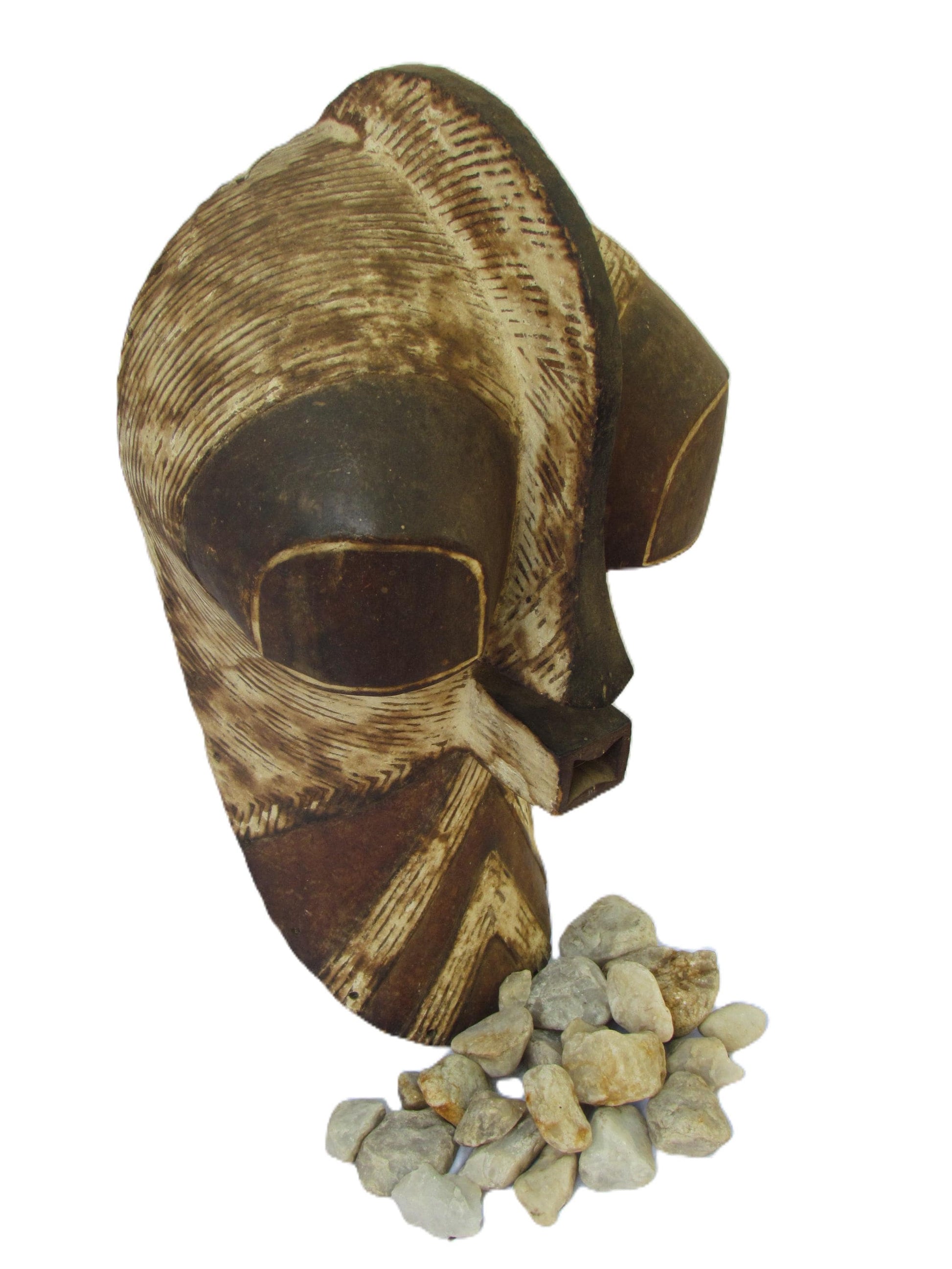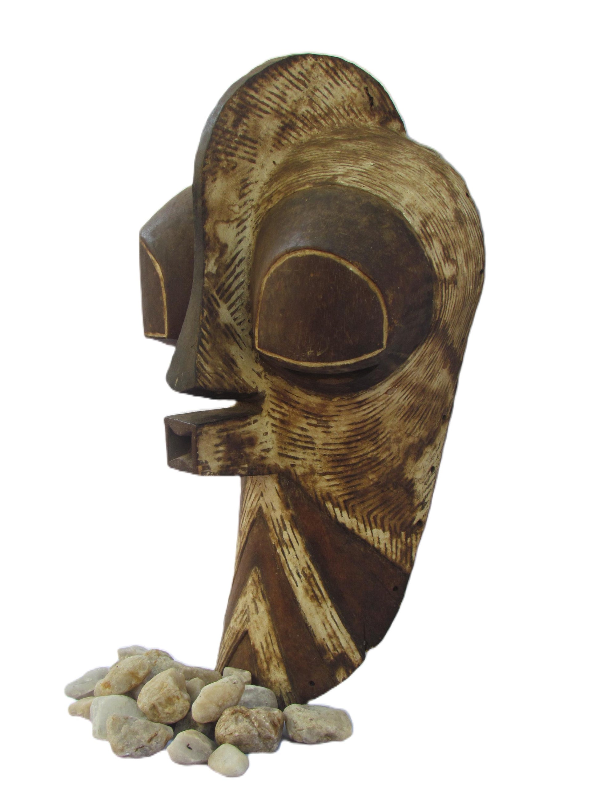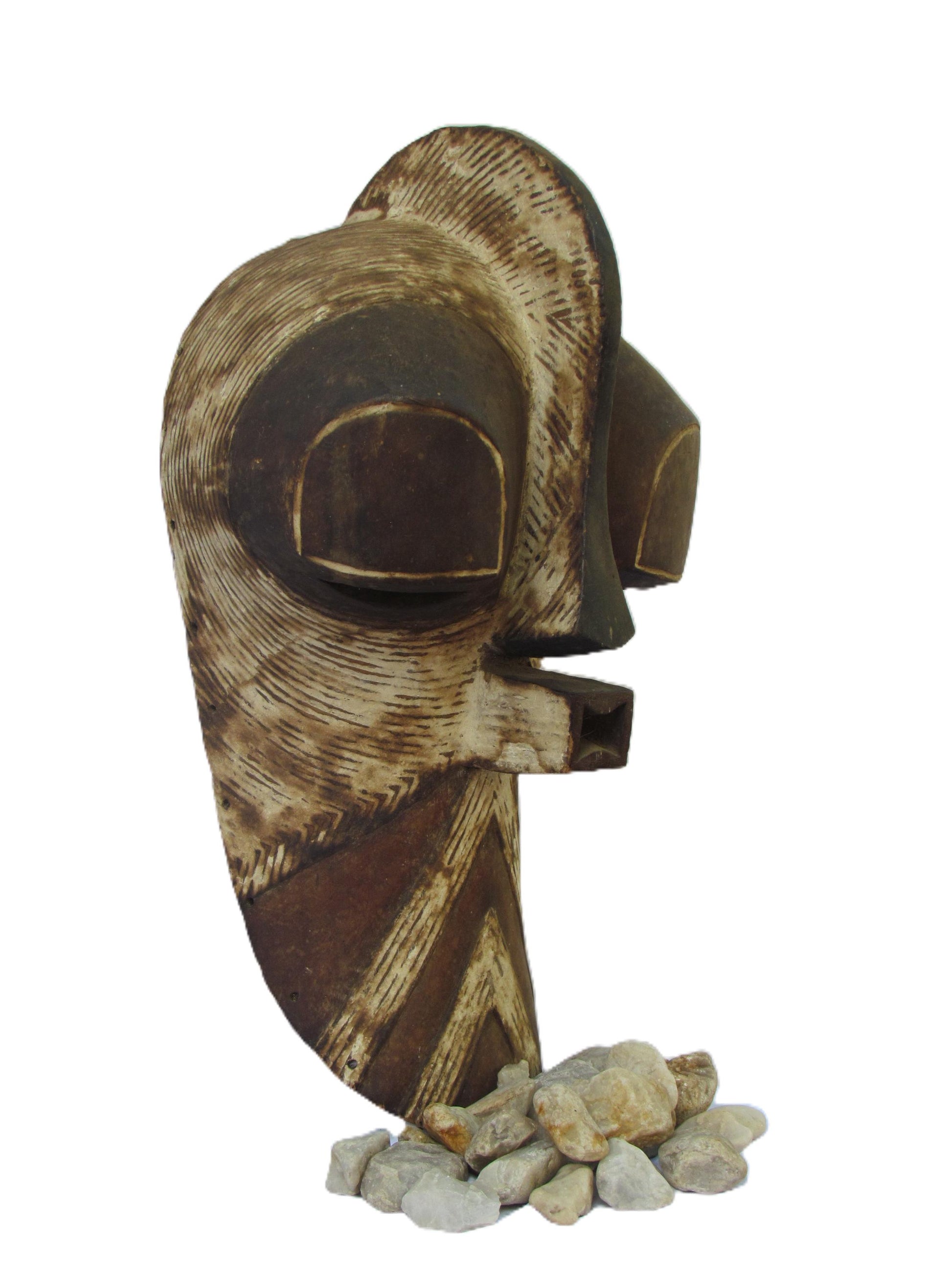 Esta gran máscara tribal Kifwebe es una pieza ceremonial artesanal del pueblo Songye de la República Democrática del Congo. Tradicionalmente utilizada en danzas rituales, presenta audaces tallas lineales, una boca cuadrada prominente y una nariz alargada, todo ello tallado en una sola pieza de madera. La superficie estriada simboliza poder, misterio y presencia ancestral. Una impactante pieza de arte mural que fusiona la historia cultural con una audaz estética tribal, perfecta para coleccionistas o como elemento decorativo.