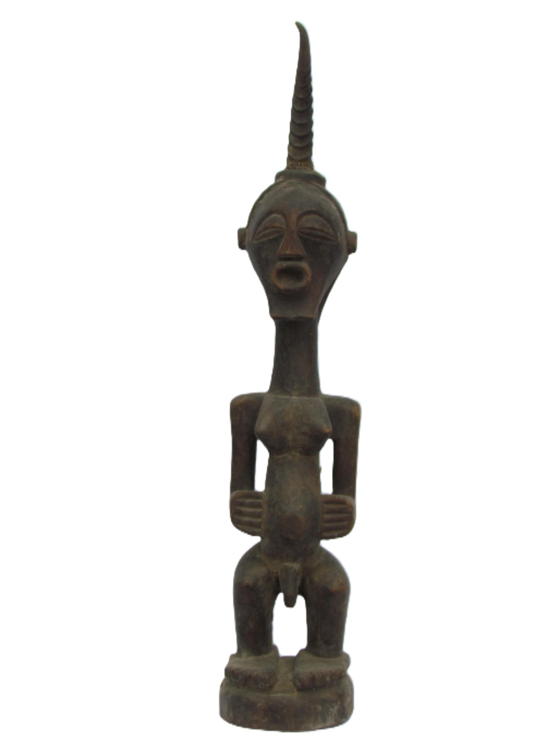 Este ejemplar de un hombre songye presenta cuatro caras en cuatro direcciones diferentes y está estrechamente vinculado a los luba, con quienes están emparentados por ancestros comunes. Según la tradición, Kongolo, fundador del primer imperio luba en el siglo XVI, era songye. Tras librar una larga guerra, los songye y los luba formaron una alianza para combatir a los árabes. En 1887, para evitar la aniquilación, un subgrupo songye, los nsapo, se trasladó al territorio lulua y, gracias a esta migración, creó un estilo escultórico original. La estructura social estaba encabezada por un jefe, asistido por innumerables sociedades secretas. Originalmente, la iniciación de los jóvenes se realizaba en el marco de la institución buhishi, pero esta desapareció a principios de siglo. Los songye utilizaban una gran cantidad de fetiches y amuletos, llamados boanga, para asegurar su éxito, fertilidad y riqueza, y para protegerse de fuerzas hostiles como los rayos, así como de enfermedades como la viruela, muy común en esa región. Región. El fetichista elaboraba la boanga con ingredientes mágicos que desmenuzaba y mezclaba, obteniendo así una pasta que se guardaba en un cuerno de antílope colgado del techo de la casa. Cuando el cabeza de familia necesitaba viajar, mandaba a hacer uno nuevo que llevaba consigo. La adivinación permitía a los Songye descubrir las causas de una desgracia. El adivino, el nganga, hacía preguntas al consultante, quien sostenía un instrumento que el adivino golpeaba. Además de los amuletos, que no siempre tienen forma humana, se encuentran grandes figuras pertenecientes al fetichista, quien las manipulaba con palos durante el ritual de luna llena. Estas figuras adoptan una postura hierática, con las manos sobre un abdomen puntiagudo; tienen un rostro alargado con frente redondeada, grandes ojos almendrados, párpados prominentes y prominentes, y una boca con forma de frijol; el cuello a veces presenta anillos alrededor y los hombros son cuadrados. En la parte superior de la cabeza, un cuerno o plumas refuerzan su aspecto inquietante. El rostro está cubierto de clavos, un recordatorio. De viruela. Bandas de cobre o latón aumentan el poder mágico de la estatua, que está vestida con plumas y pieles y porta una pequeña bolsa de pociones. Los enormes pies están integrados en la base, un método que también se encuentra entre los chokwe. Los fetichistas usaban estatuillas montadas sobre un pedestal, con el contenido mágico fijado con un clavo en la parte superior del cráneo.