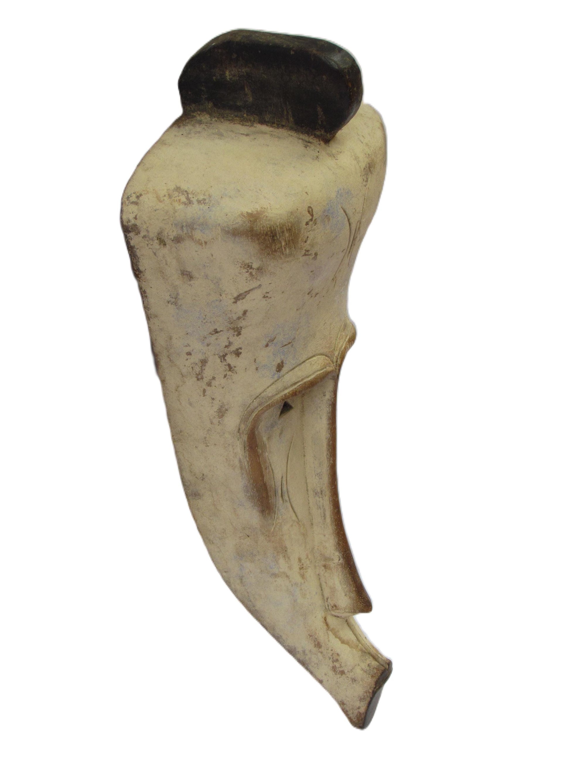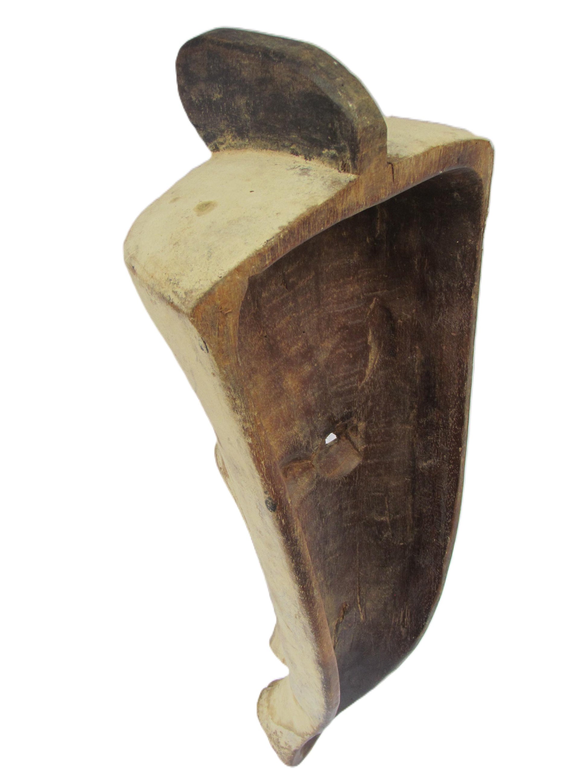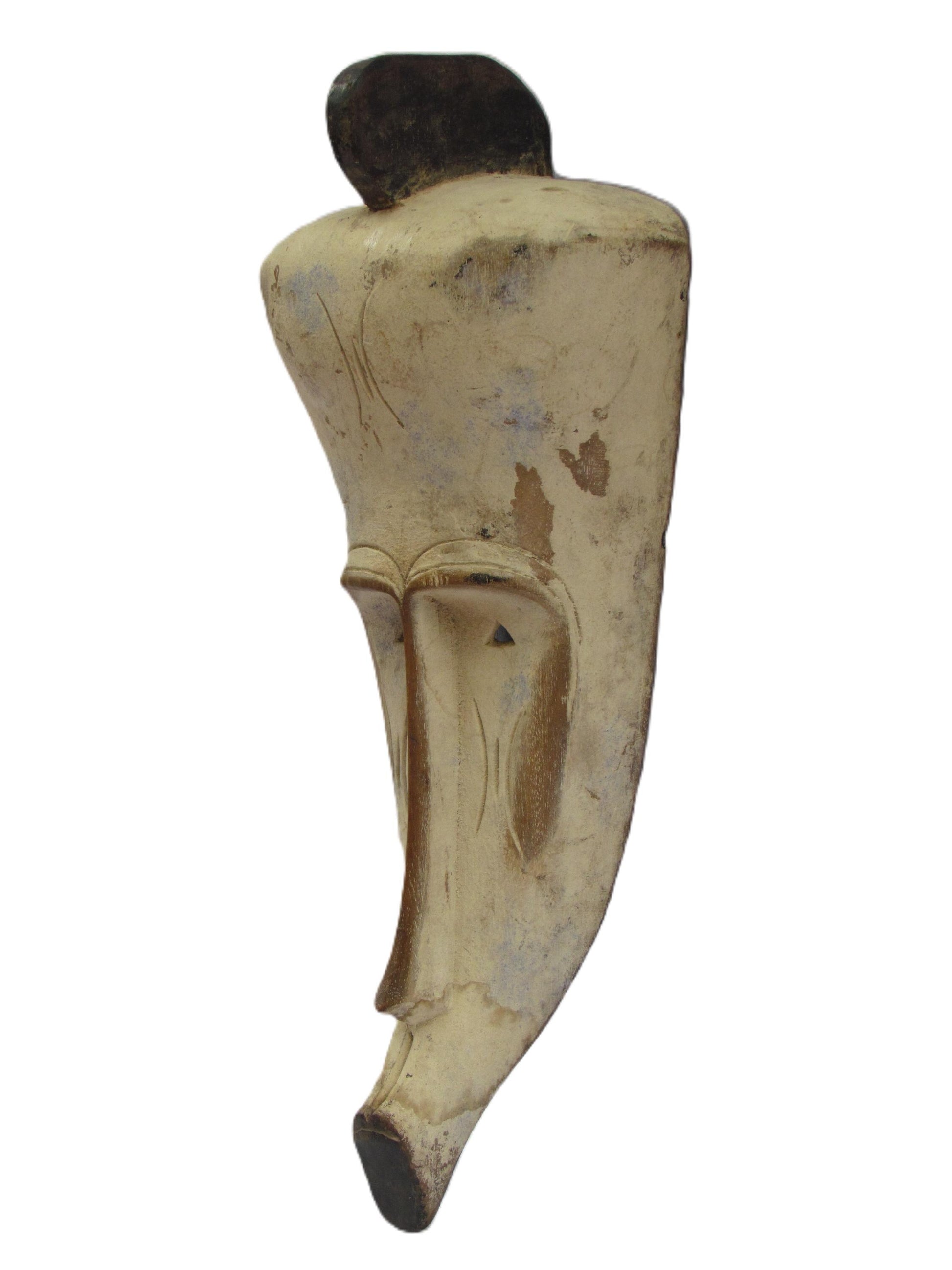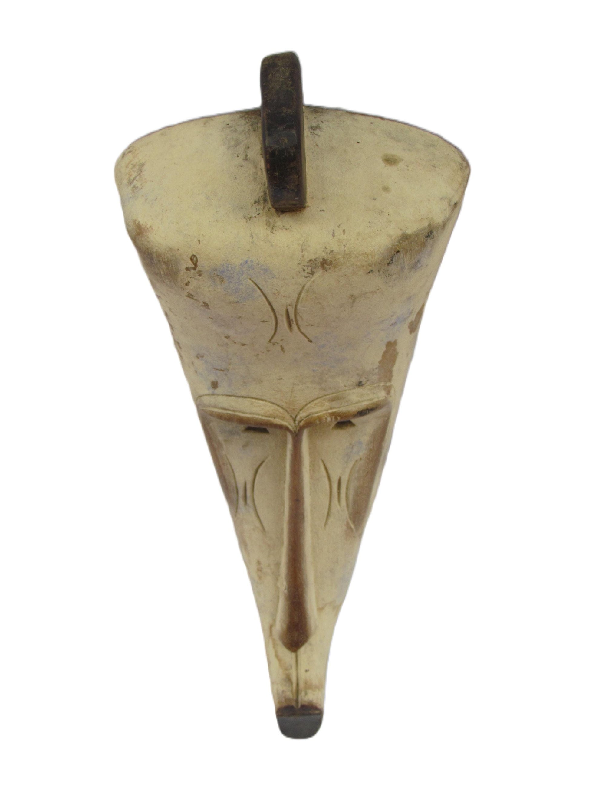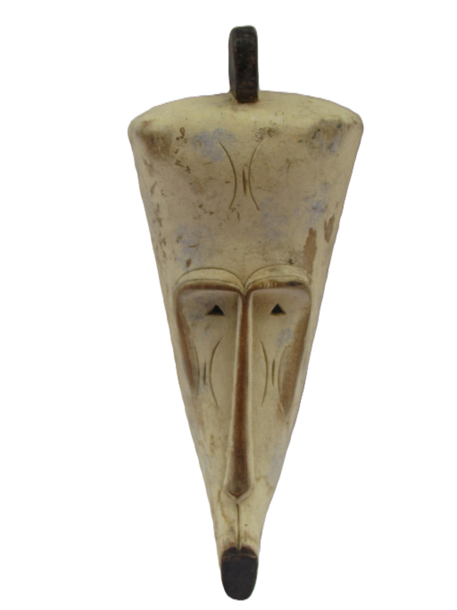Esta poderosa máscara fue tallada a mano por hábiles artesanos fang en Gabón. Estas máscaras se usaban durante la iniciación de los nuevos miembros del grupo o durante la vigilancia comunitaria. El Nigil era una sociedad masculina secreta dentro del pueblo fang, encargada de proteger y administrar justicia, así como de mantener la paz entre clanes y aldeas. La sociedad Ngil participaba en rituales y ceremonias destinados a disuadir a las personas de la comunidad con malas intenciones y combatir la brujería. Sin embargo, este grupo y sus tradiciones fueron proscritos a finales de la década de 1920 por las autoridades francesas. Estas máscaras están hechas de madera, que luego se cubre con una capa de arcilla blanca y blanda llamada caolinita. El color blanco de estas máscaras se asocia con elementos como los espíritus de los antepasados, la muerte y la virilidad masculina. La mayoría de las máscaras Ngil tienen forma ovalada, con una frente ancha y una barbilla y nariz alargadas. Una de las características que las definen son las cejas altas y redondeadas y un rostro alargado y terso, que posiblemente reflejaba la identidad Ngil. Nombre de la sociedad, que significa "gorila".