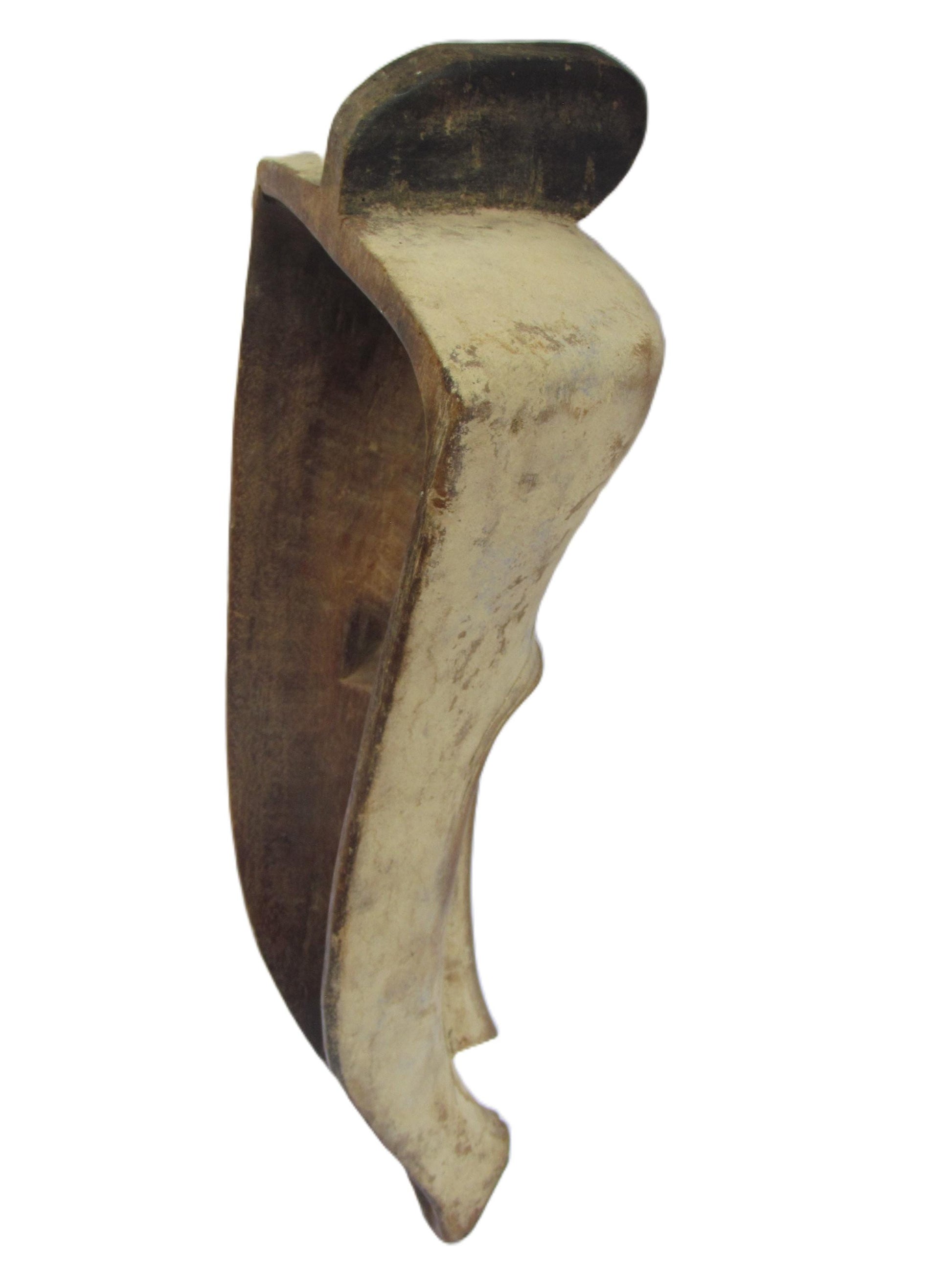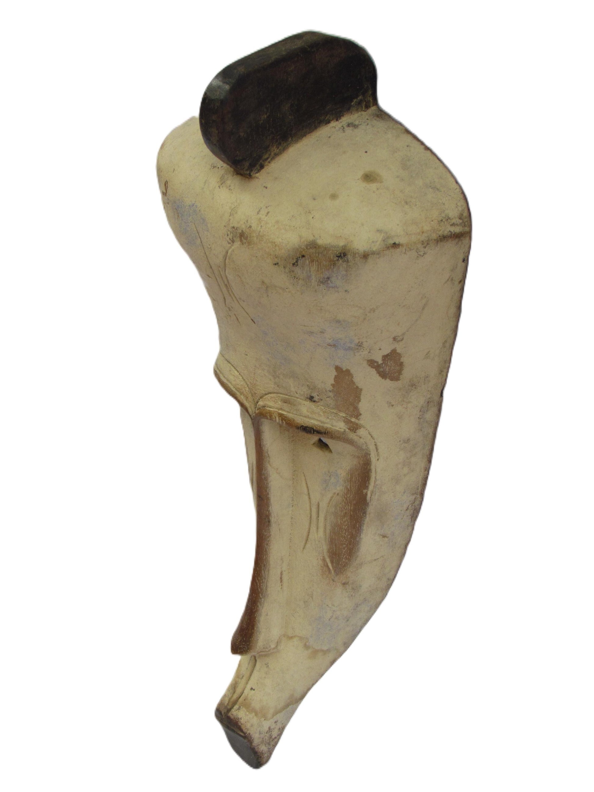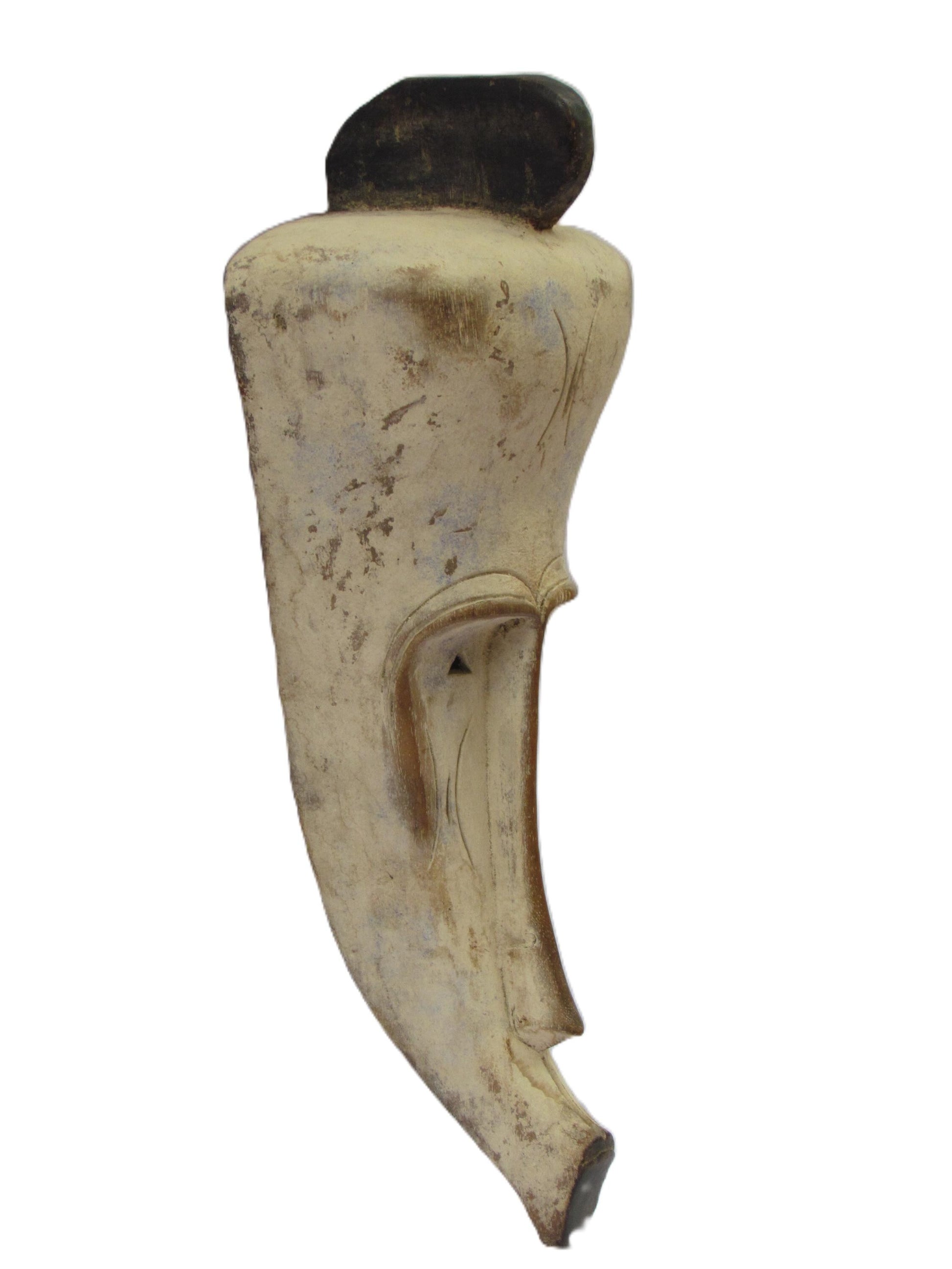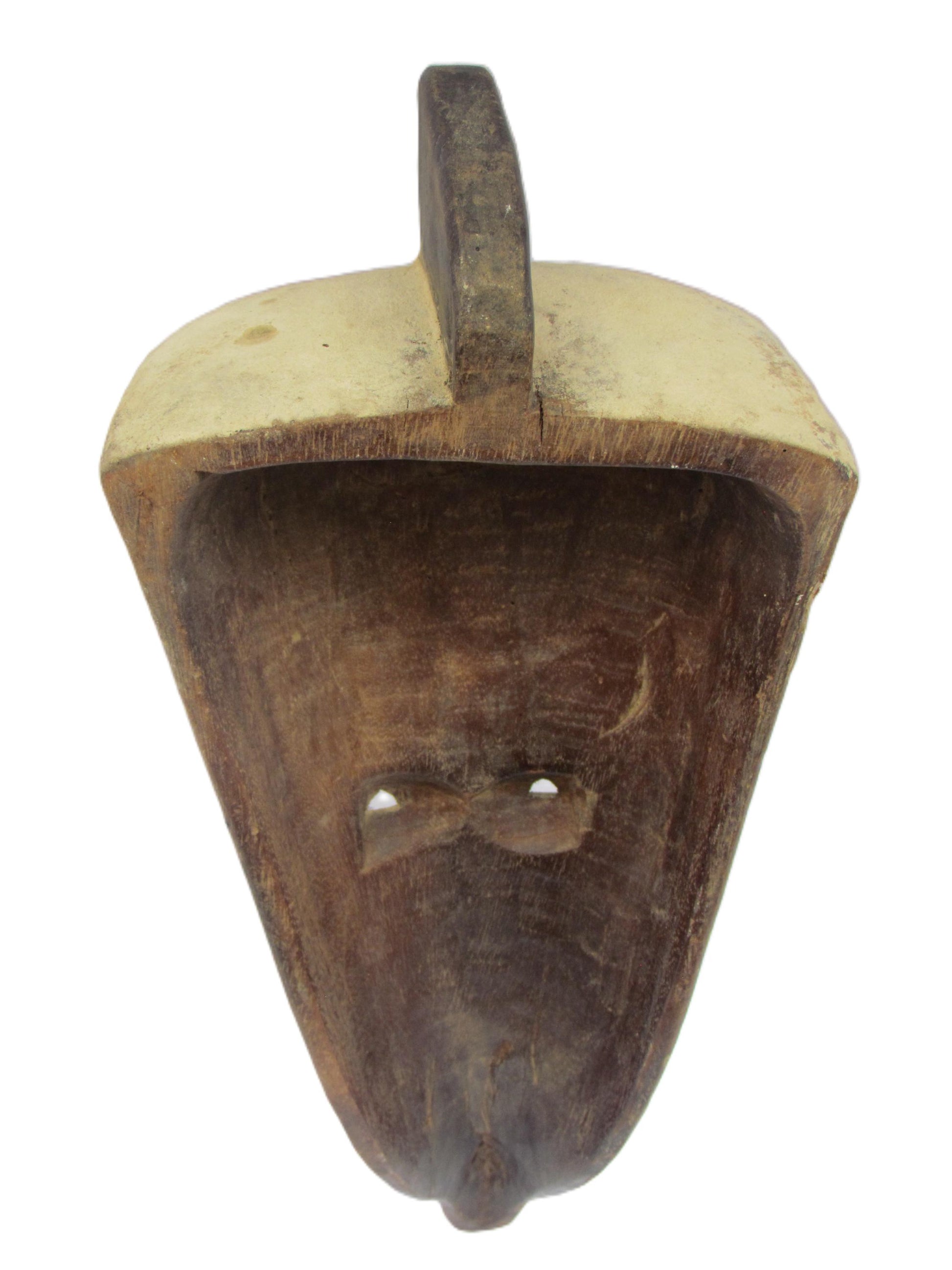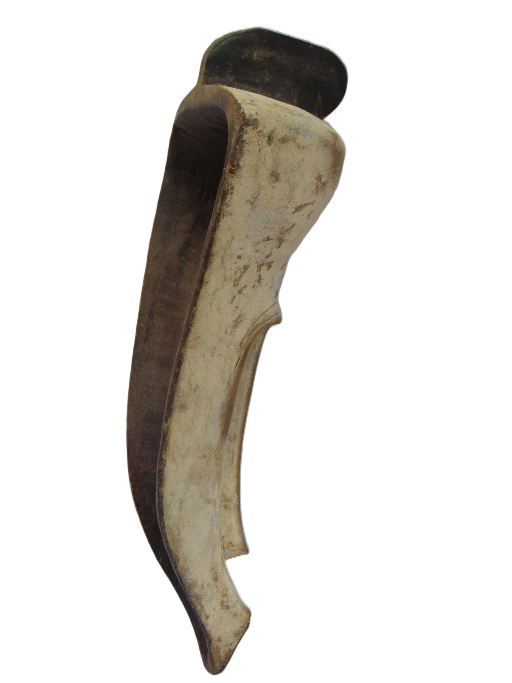 Esta poderosa máscara fue tallada a mano por hábiles artesanos fang en Gabón. Estas máscaras se usaban durante la iniciación de los nuevos miembros del grupo o durante la vigilancia comunitaria. El Nigil era una sociedad masculina secreta dentro del pueblo fang, encargada de proteger y administrar justicia, así como de mantener la paz entre clanes y aldeas. La sociedad Ngil participaba en rituales y ceremonias destinados a disuadir a las personas de la comunidad con malas intenciones y combatir la brujería. Sin embargo, este grupo y sus tradiciones fueron proscritos a finales de la década de 1920 por las autoridades francesas. Estas máscaras están hechas de madera, que luego se cubre con una capa de arcilla blanca y blanda llamada caolinita. El color blanco de estas máscaras se asocia con elementos como los espíritus de los antepasados, la muerte y la virilidad masculina. La mayoría de las máscaras Ngil tienen forma ovalada, con una frente ancha y una barbilla y nariz alargadas. Una de las características que las definen son las cejas altas y redondeadas y un rostro alargado y terso, que posiblemente reflejaba la identidad Ngil. Nombre de la sociedad, que significa "gorila".
