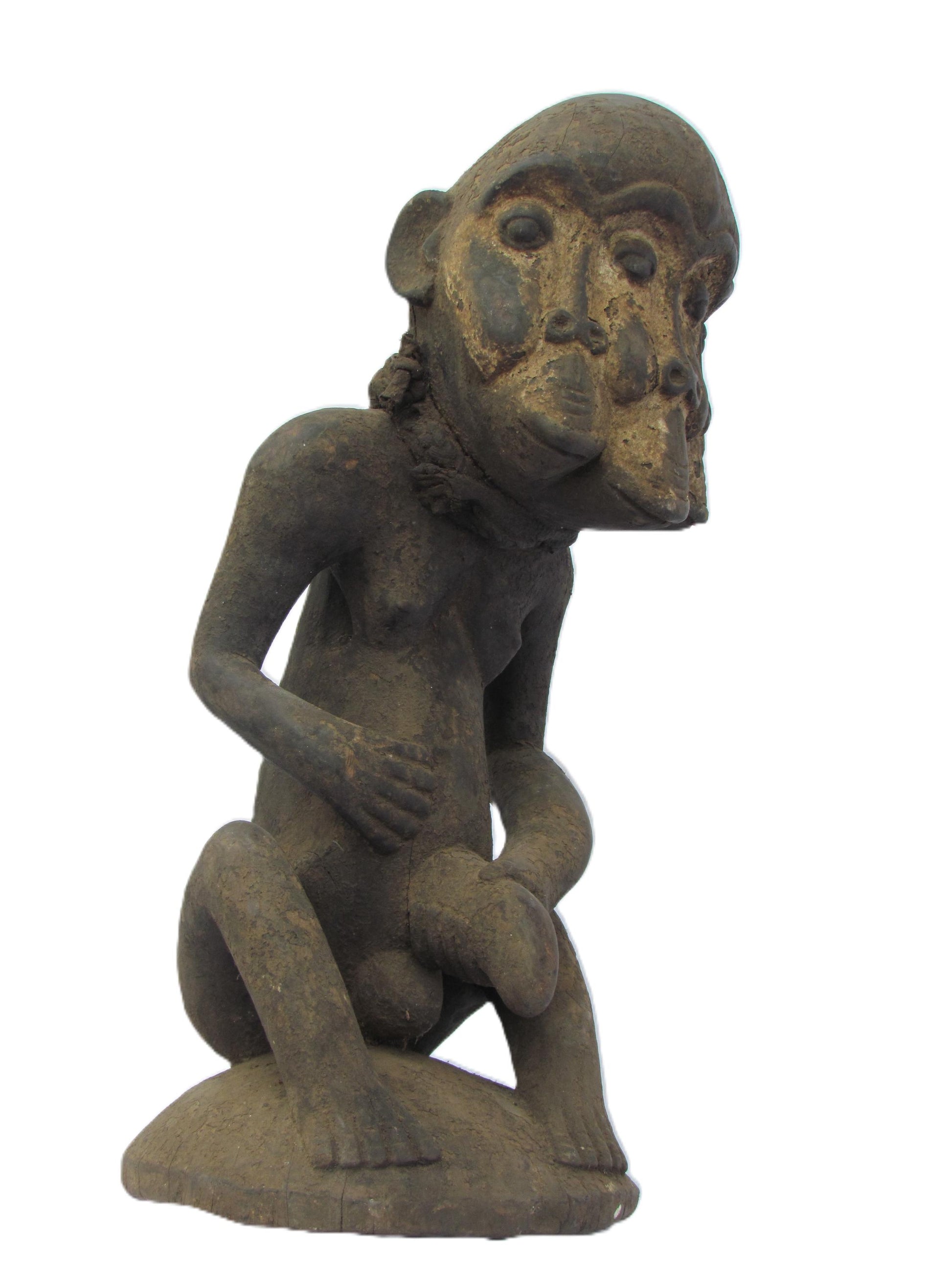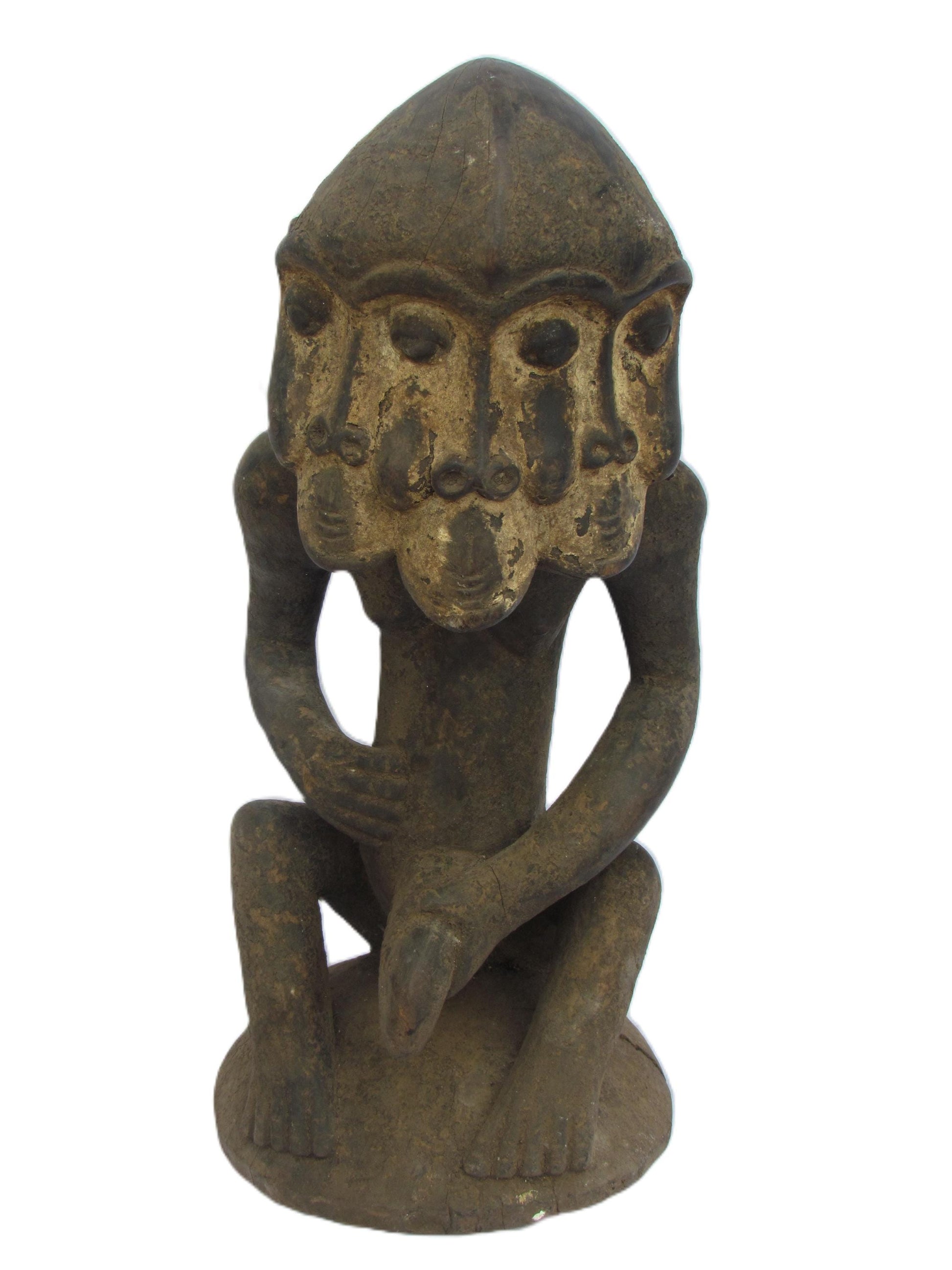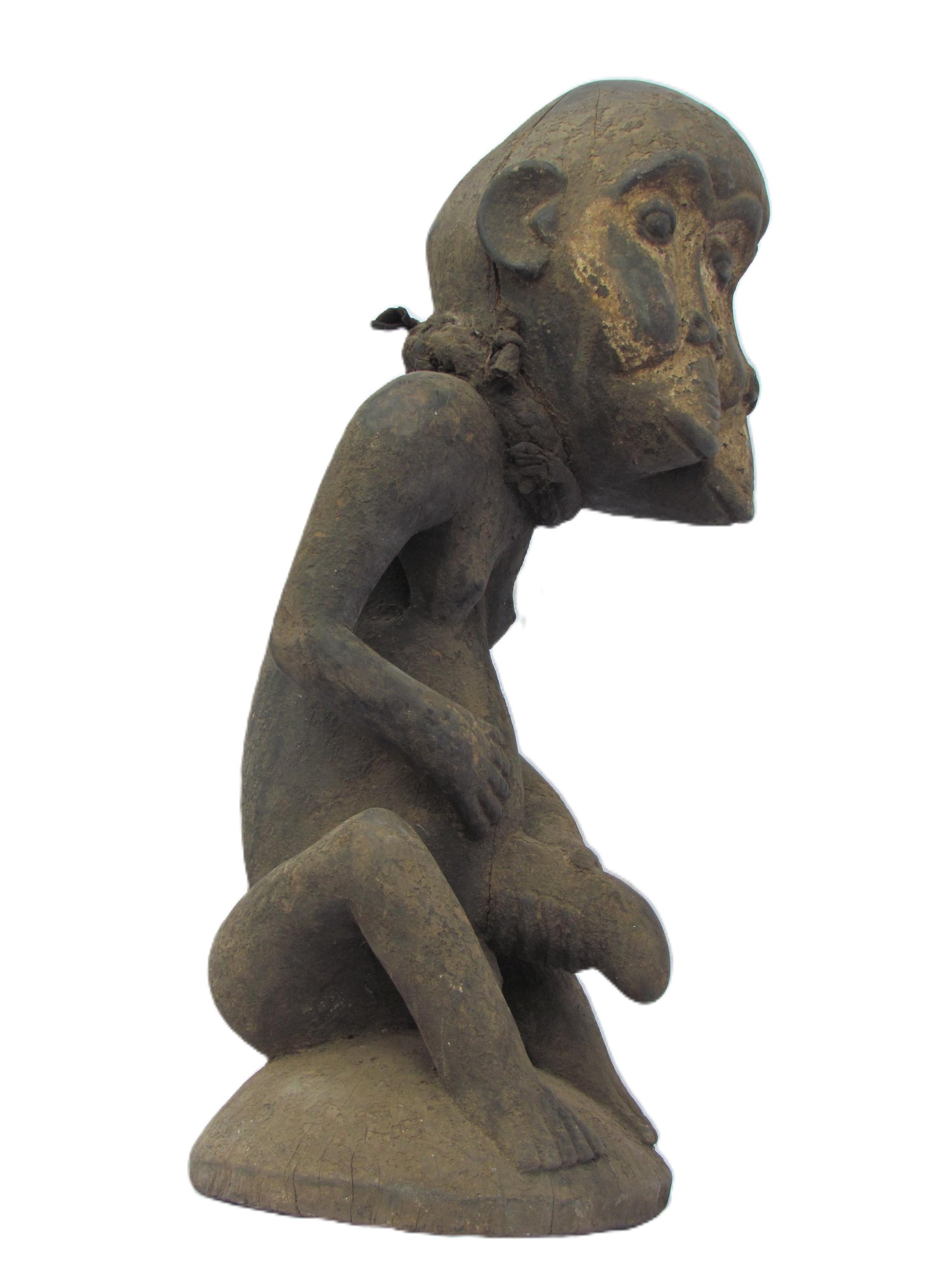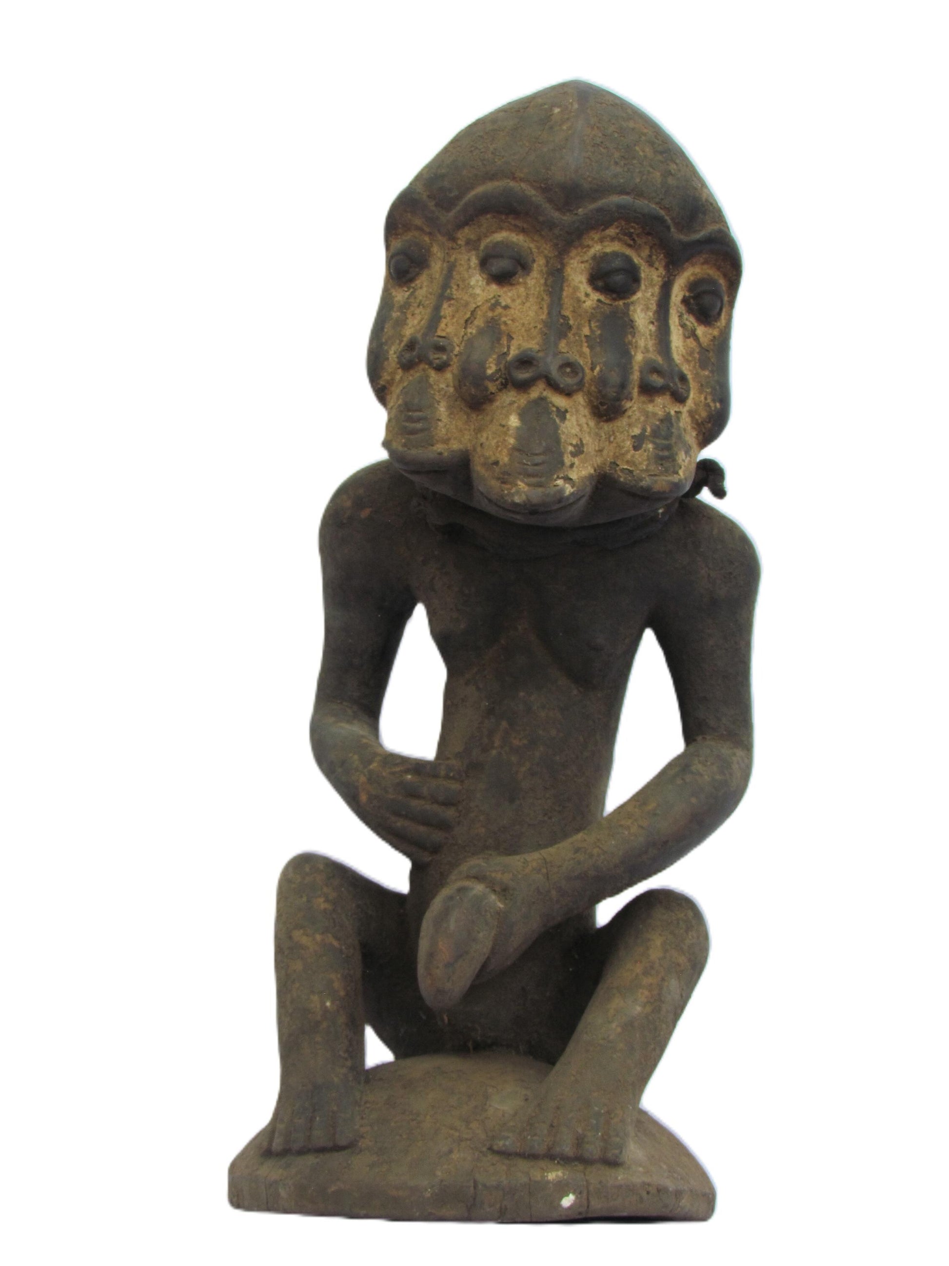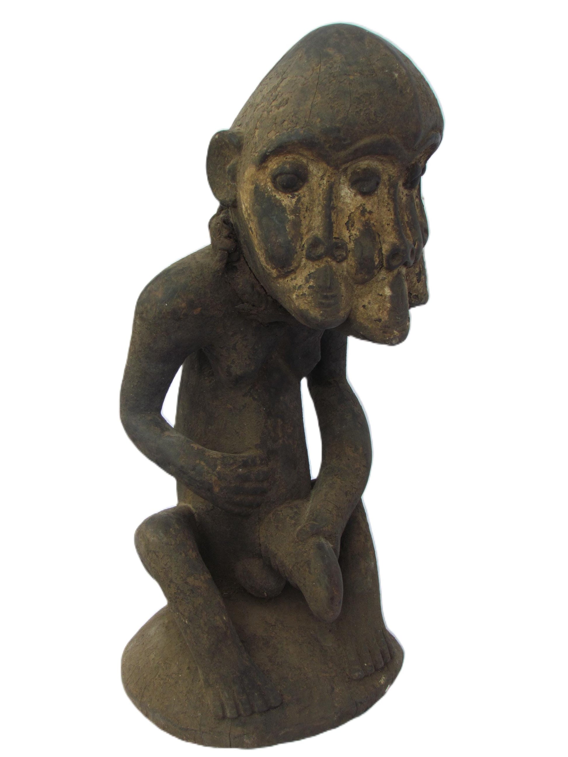 Seating Songo Male Luba Figure holding an elected Genital Organ with Three Faces, Democratic Republic of Congo & Zambia.
