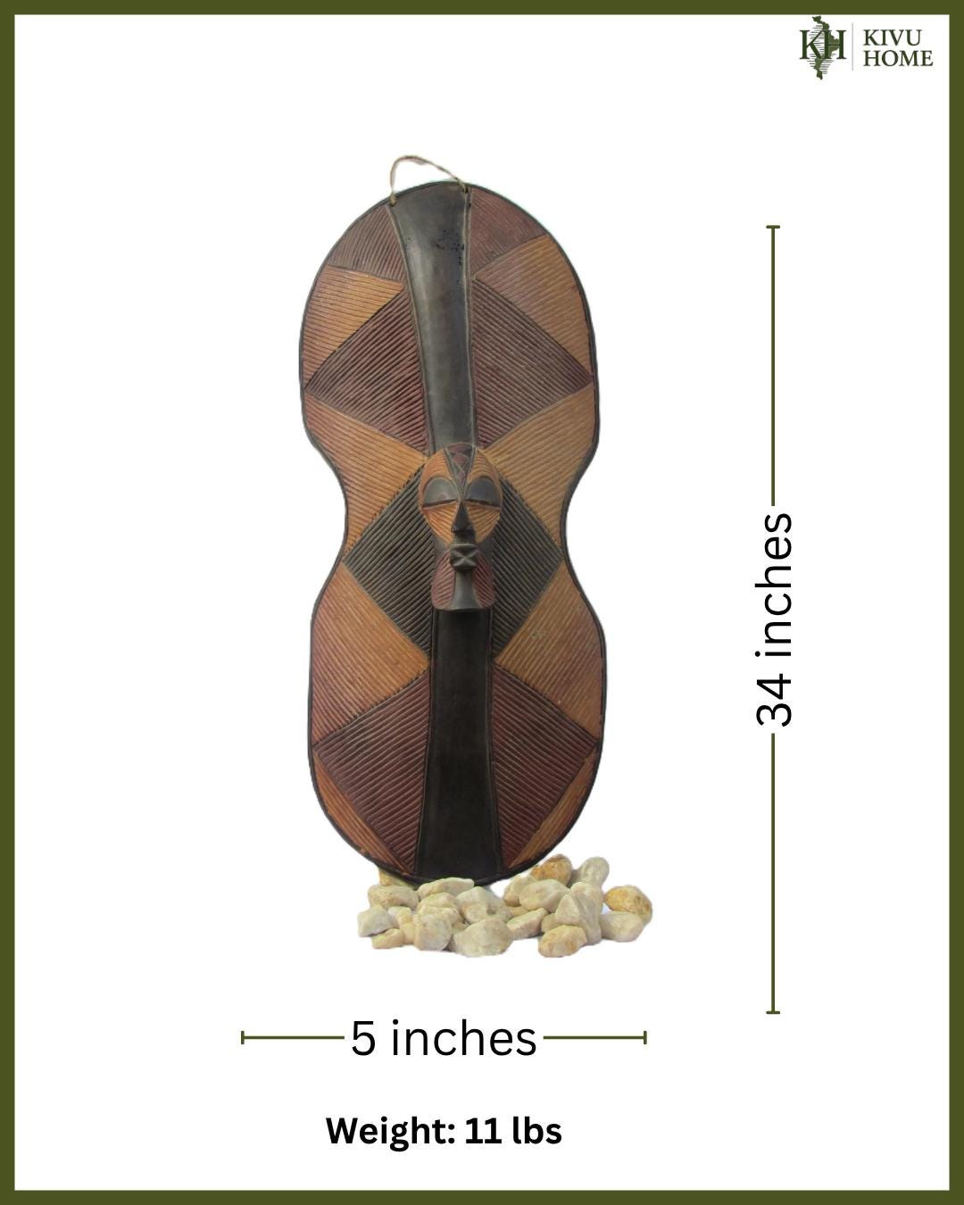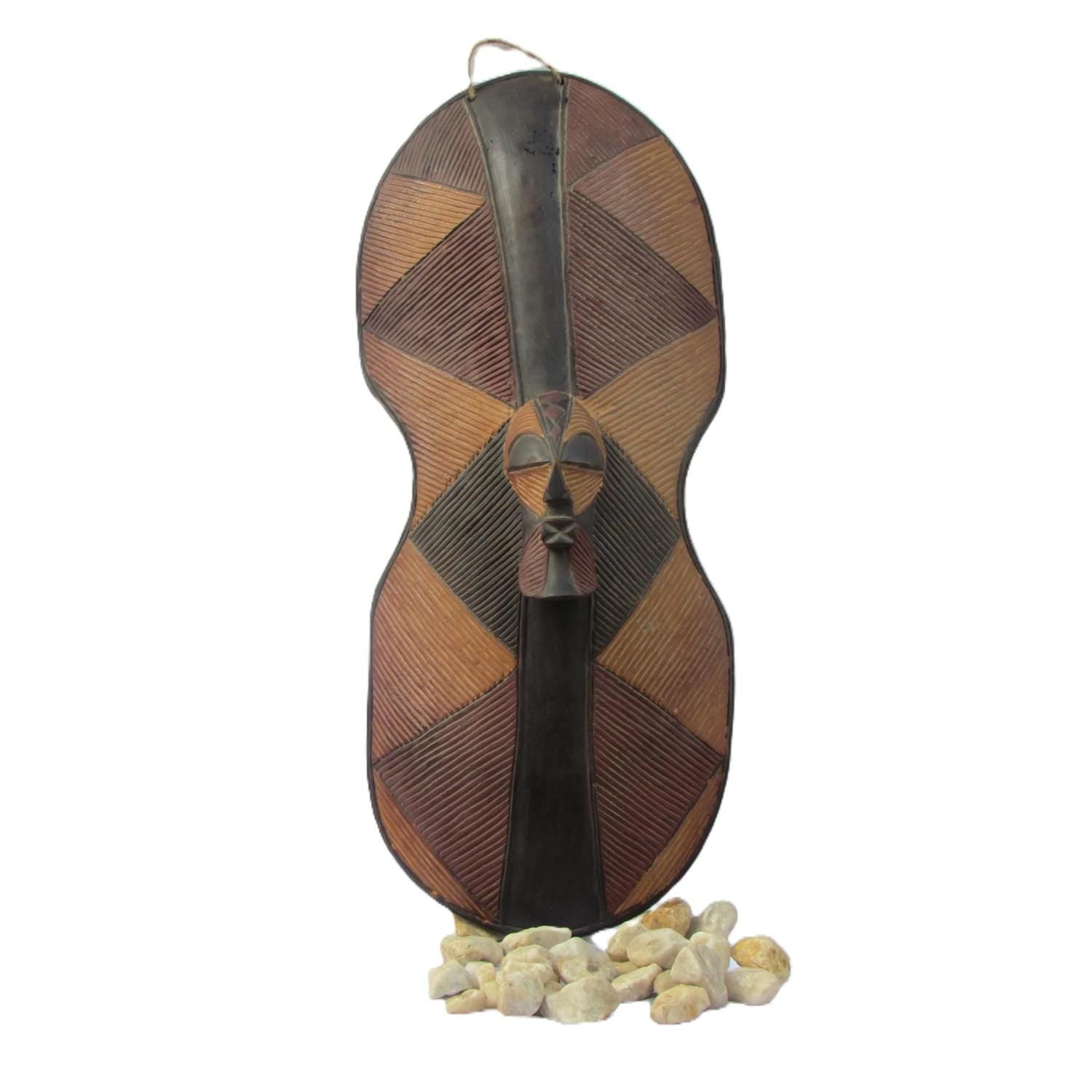 Inspired by traditional Central African artistry, each shield is carefully hand-carved from a single piece of wood by skilled artisans. Originating from the Songye people of the Democratic Republic of Congo, this vintage shield features a central mask icon—a motif representing high social status and spiritual authority. In Songye culture, these shields served both protective and symbolic roles, embodying the strength of the warrior and the presence of ancestral spirits. The bold, aggressive artistry and rhythmic lines are hallmark traits of Songye craftsmanship.