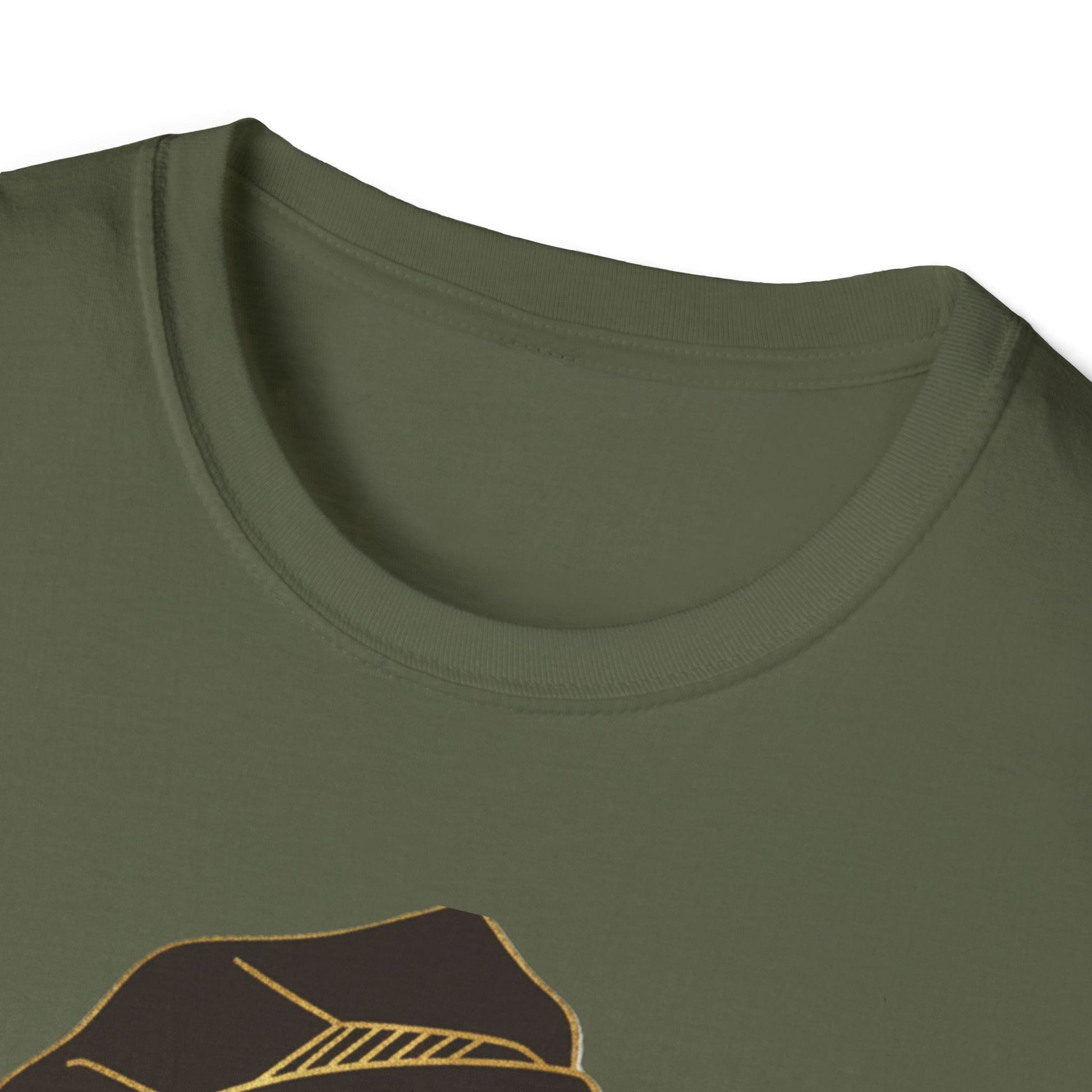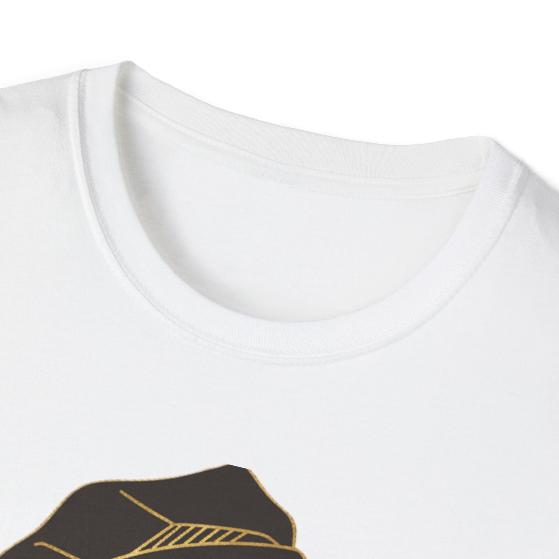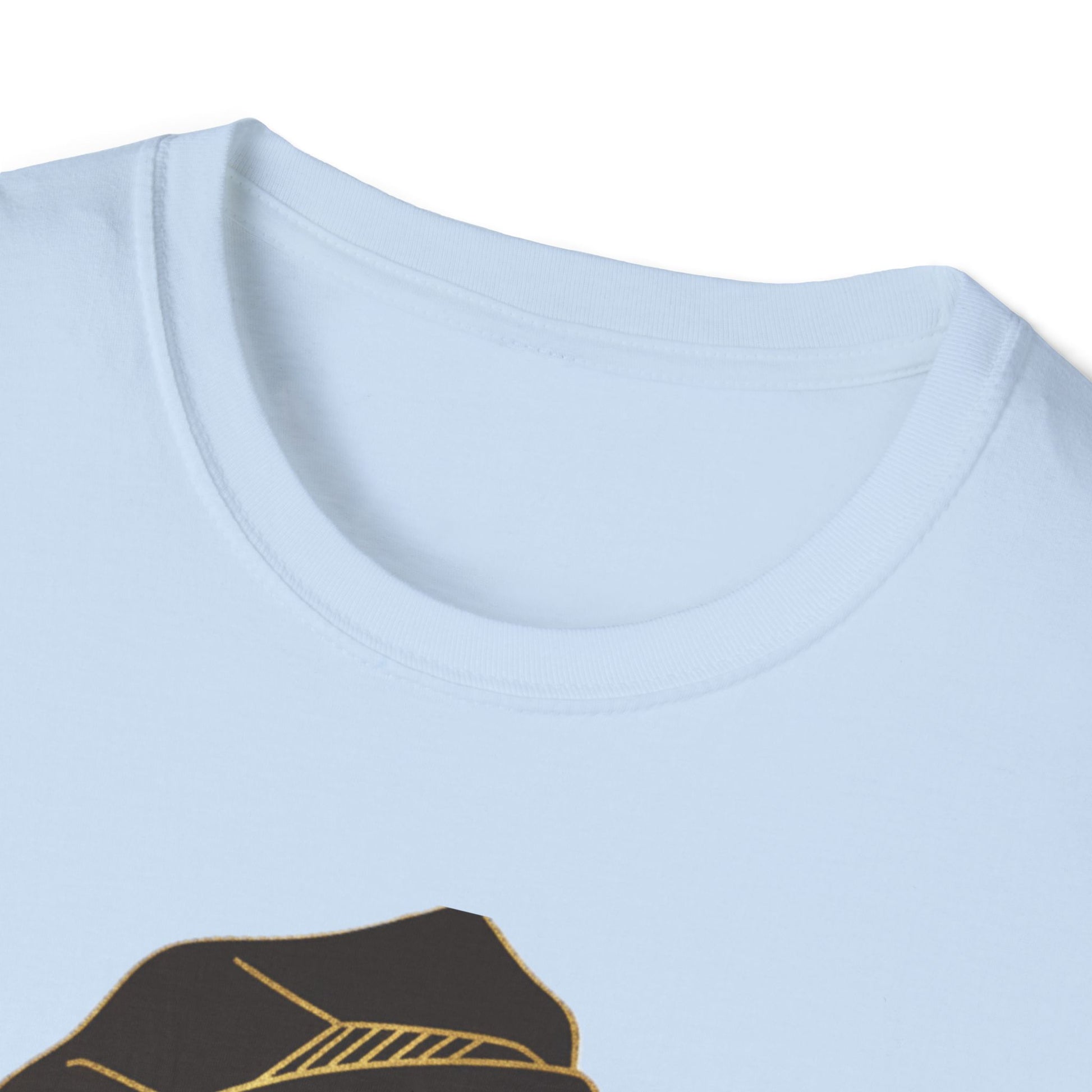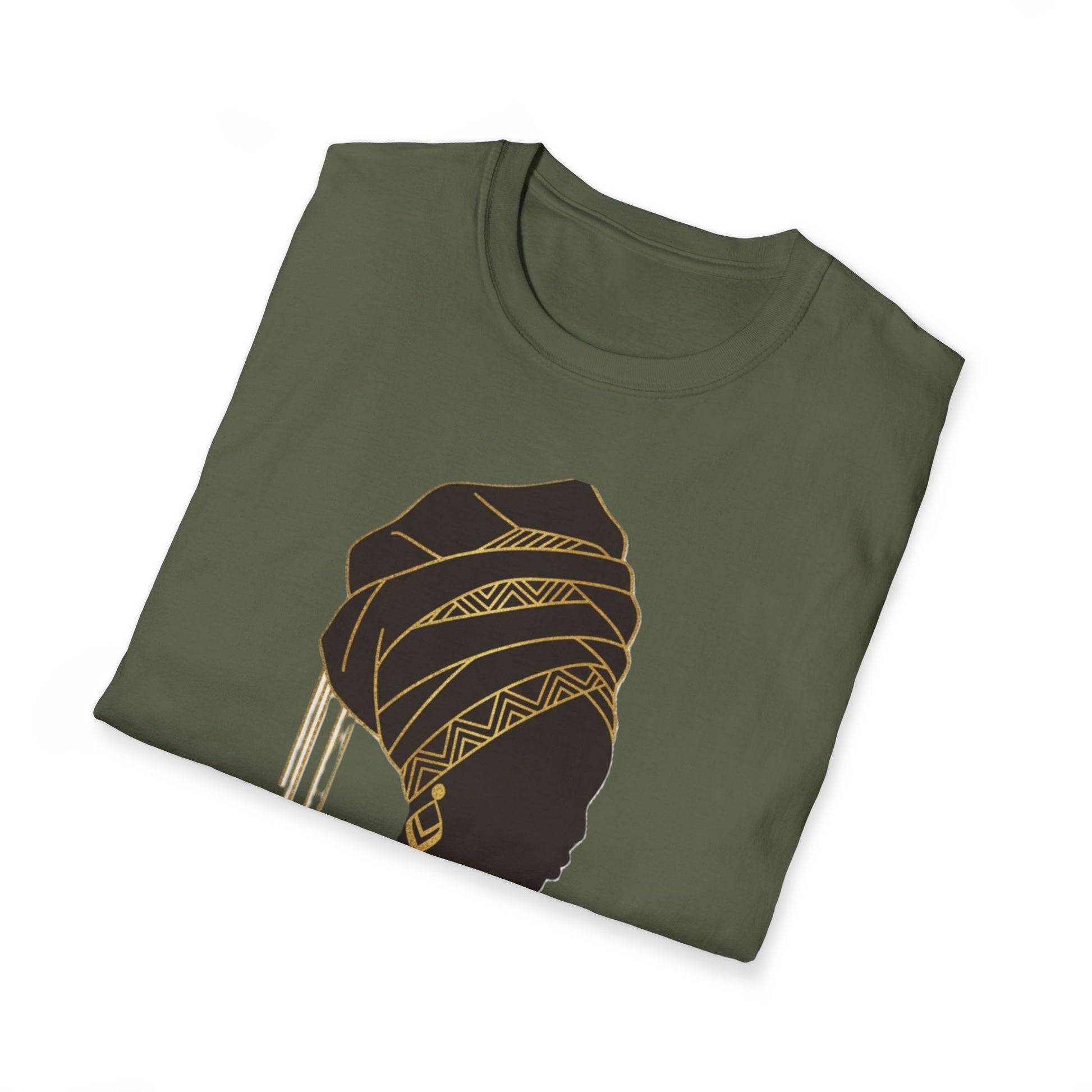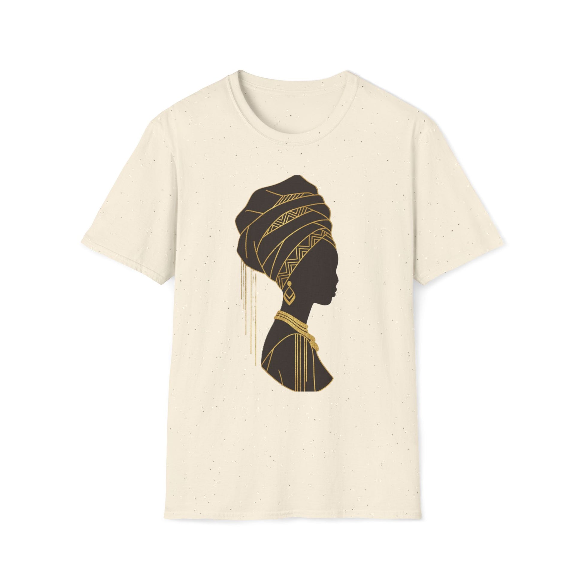 A soft, breathable tee that carries quiet strength and timeless style. The silhouette print — a poised profile wrapped in an elegant headwrap with delicate gold accents — reads like a private portrait. Lightweight ring-spun cotton sits close to the skin without clinging, so this shirt moves with you from slow mornings to city evenings. Wear it to ground a layered outfit, bring subtle art into your day, or let it speak for you when words feel unnecessary. The design feels both modern and reverent — a wearable reminder of heritage, grace, and calm confidence.