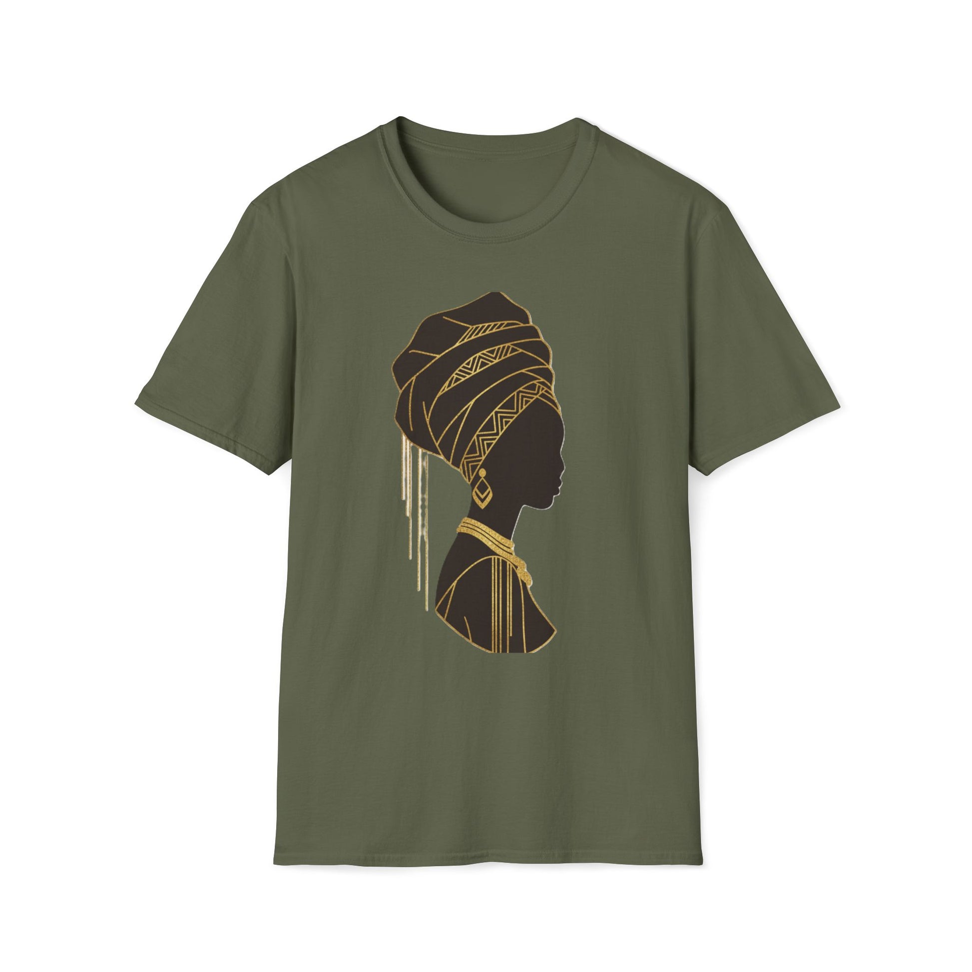 African Goddess Silhouette T-Shirt — Black Woman Profile with Gold Headwrap