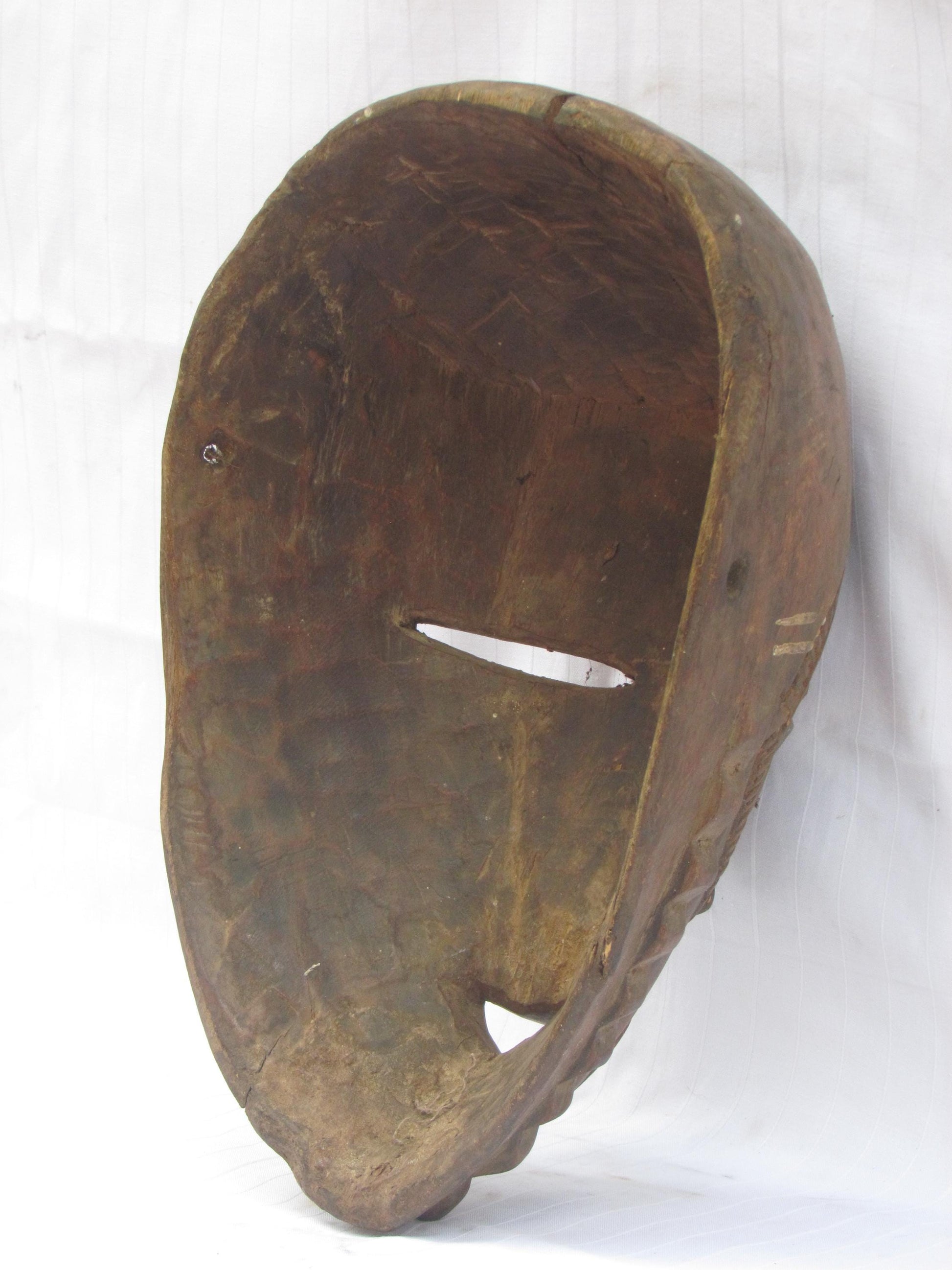 This mask is hand carved from the African country of D.R.C from the Kusu tribe. This hand carved piece of art is an antique and represents the rich cultural heritage of the Kusu used for ceremonial events which give you a glimpse into its history and traditions. This wooden art is perfect for collectors or those interested in African art and craftsmanship.